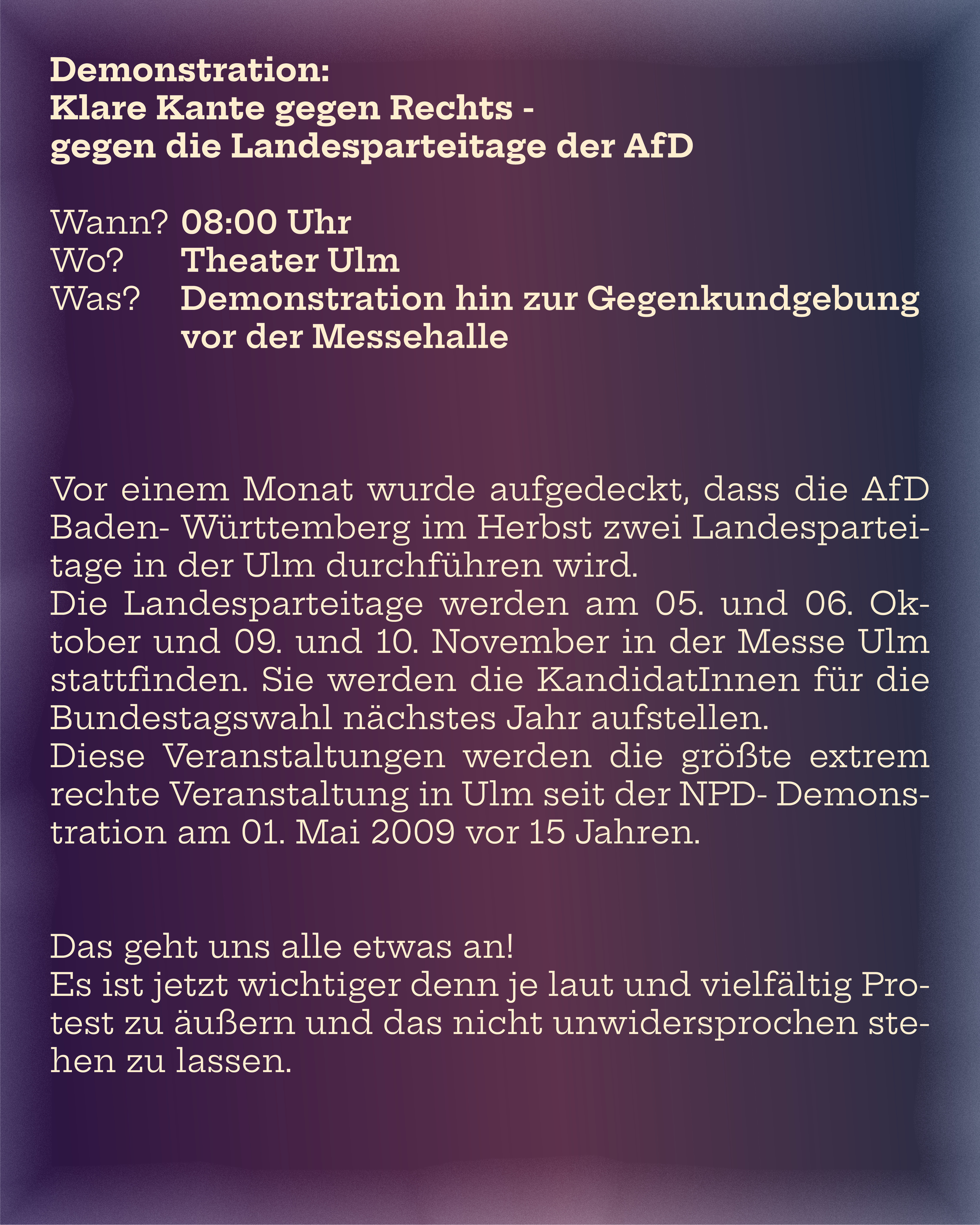 Wir wollen mit euch gemeinsam am 05. Oktober, dem ersten Tag der Landesparteitage, morgens in einer kraftvollen Demonstration durch die Stadt zur Messe Ulm laufen, um uns dann dort der Protestkundgebung anzuschließen. Wir wollen so unseren Protest und unsere Wut durch die Stadt direkt zu den ankommenden AfD- Mitgliedern tragen.