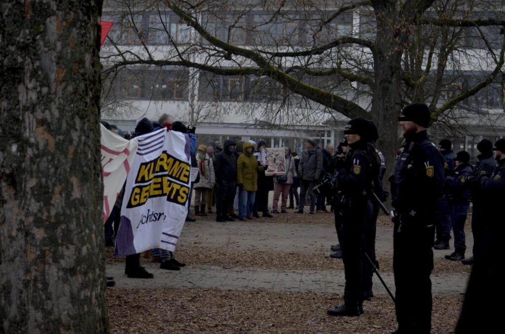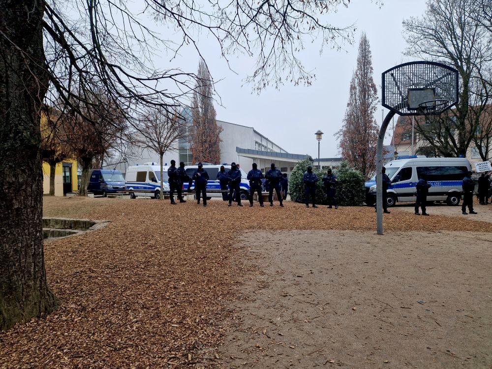 - Auf der anderen Seite: neben den immer gleichen älteren AfD Ulm Kreis waren einige grimmig dreinschauende Polizeieinsatzkräfte da – mit gezückten Kameras, Schlagstöcken und abgerichteten Hunden, denen vorsorglich der Maulkorb entfernt wurde.