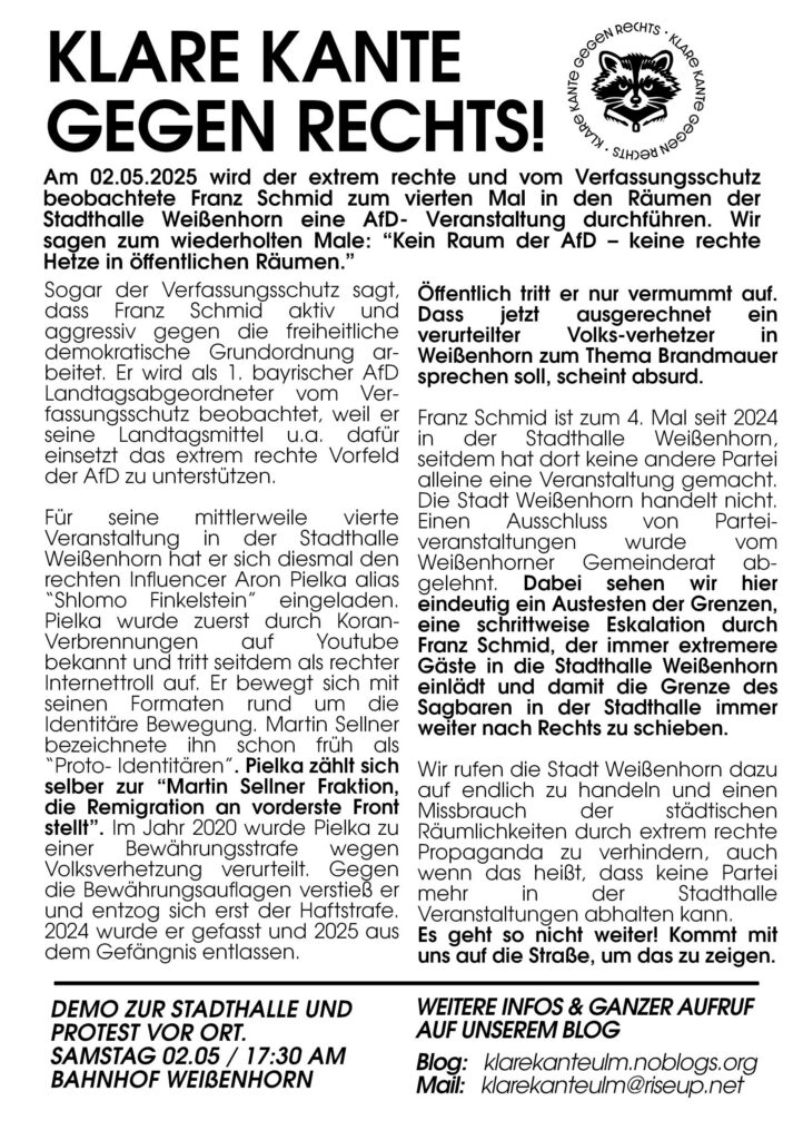 Am 02.05.2026 wird der extrem rechte und vom Verfassungsschutz beobachtete Franz Schmid zum vierten Mal in den Räumen der Stadthalle Weißenhorn eine AfD-Veranstaltung durchführen. Wir sagen zum wiederholten Male: