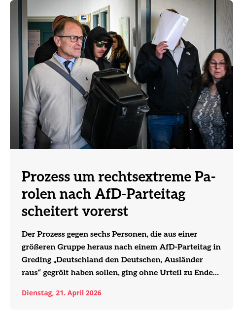 - 21.04.2026 Artikel von Endstation Rechts zum Prozess rund um die Parolen in Greding: https://www.endstation-rechts.de/news/prozess-um-rechtsextreme-parolen-nach-afd-parteitag-scheitert-vorerst
